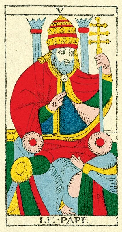 Quando nos aproximamos do Arcano V, é certo que estamos diante de algo luminoso e divino tal como a quintessência mítica do éter. Para Sallie Nichols1, o Papa é a face visível de Deus: a manifestação física daquilo que a alma conhece através da própria transcendência (quando vive a experiência mística da Papisa, o Arcano II). Em primeiro lugar, é válido lembrar que a iconografia medieval do Tarot traz uma boa dose de influência cristã, e por essa razão a figura máxima da autoridade religiosa nos arcanos é representada pelo chefe da Igreja Católica.